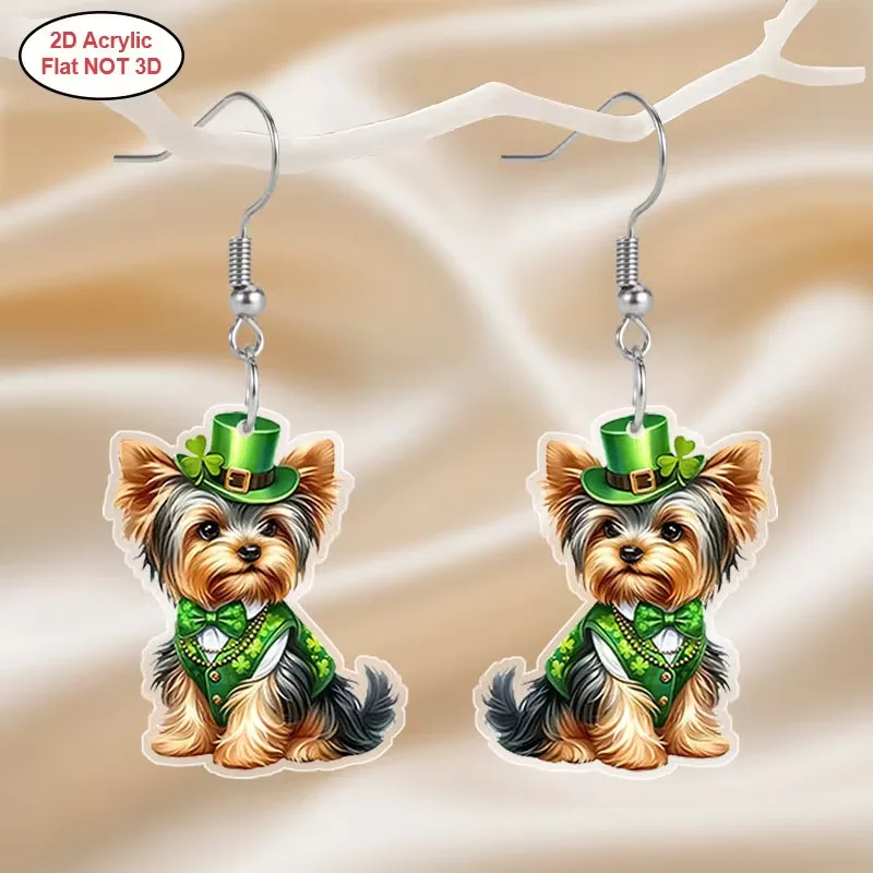 Acrylic Cute Yorkie Wearing Green Hat Earrings
