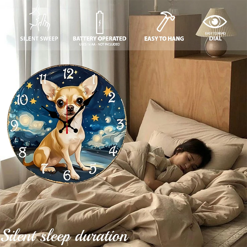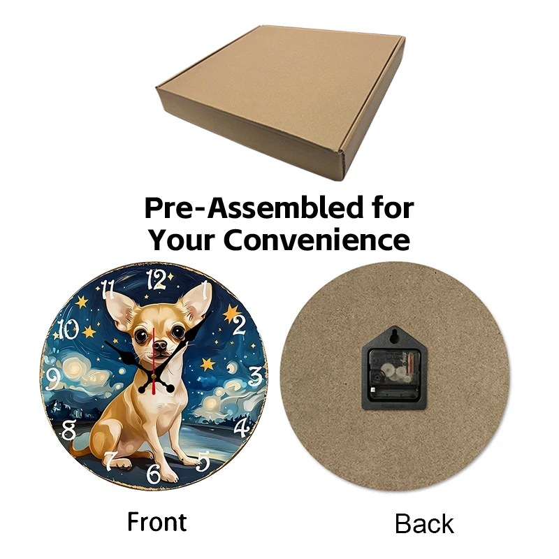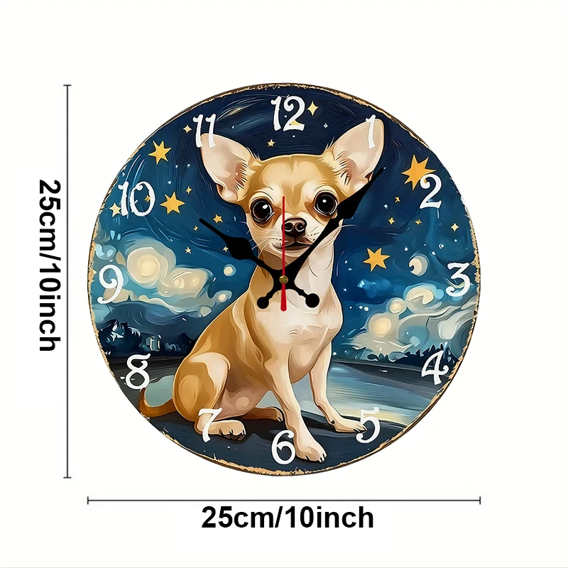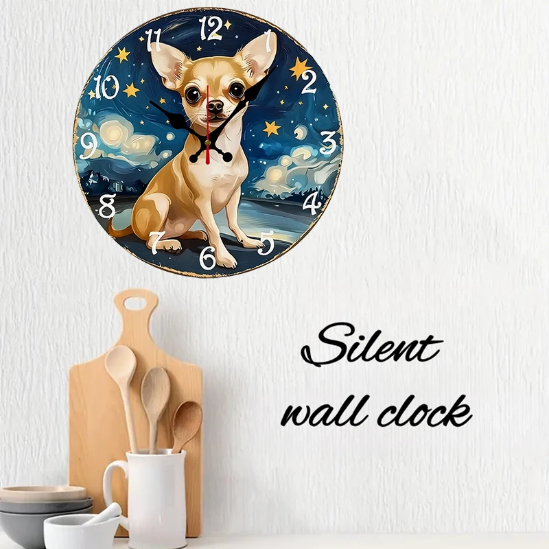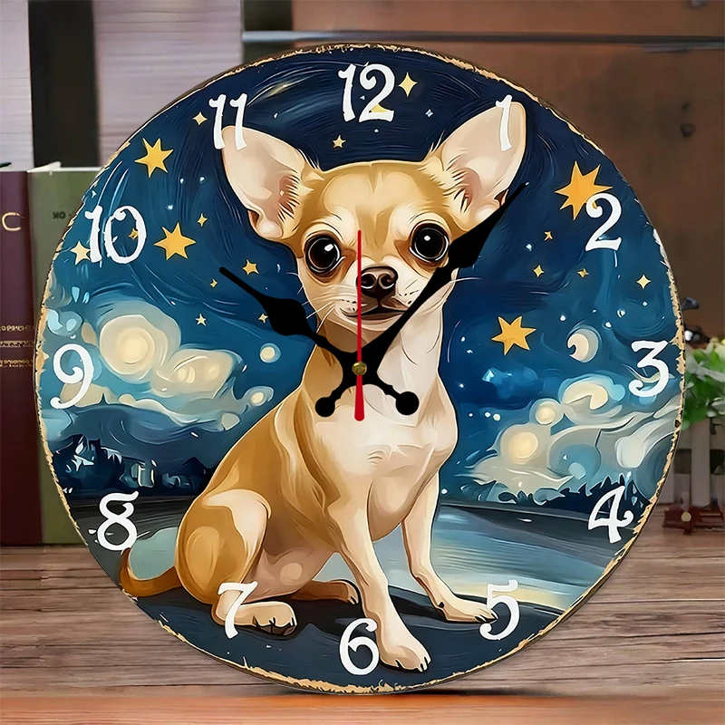 Chihuahua Dog Wooden Round Silent Hanging Wall Clock