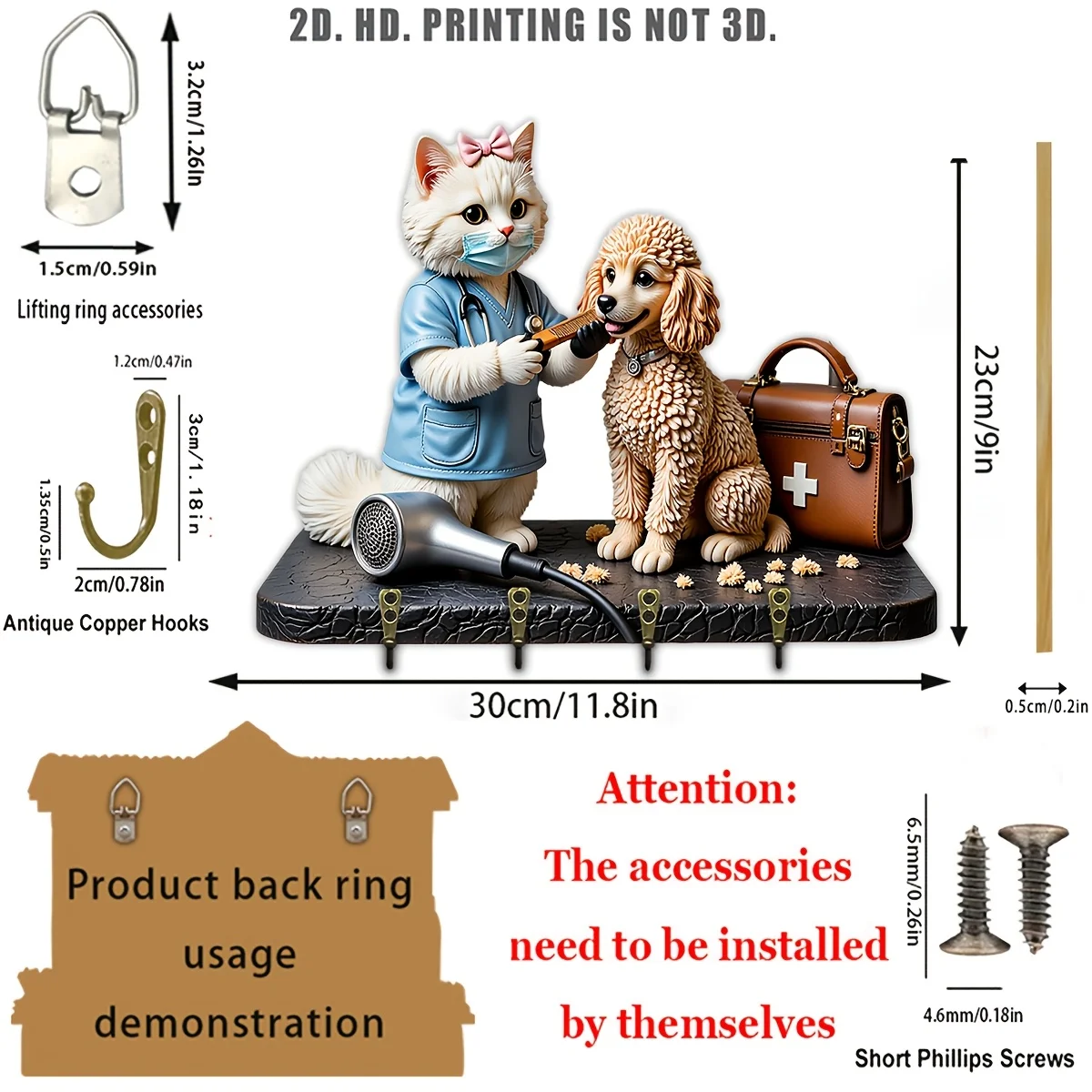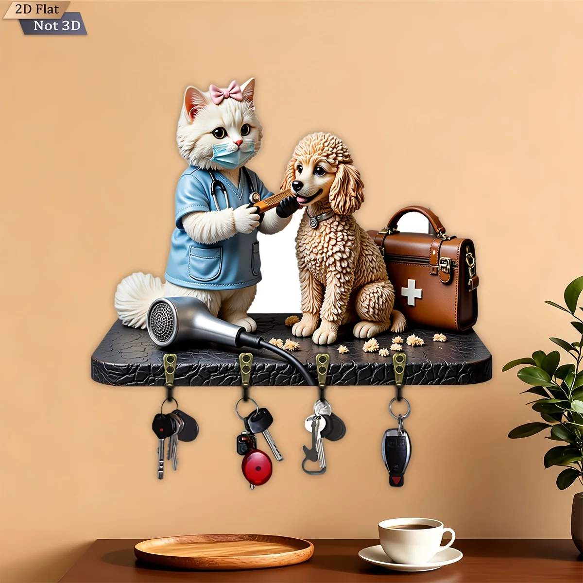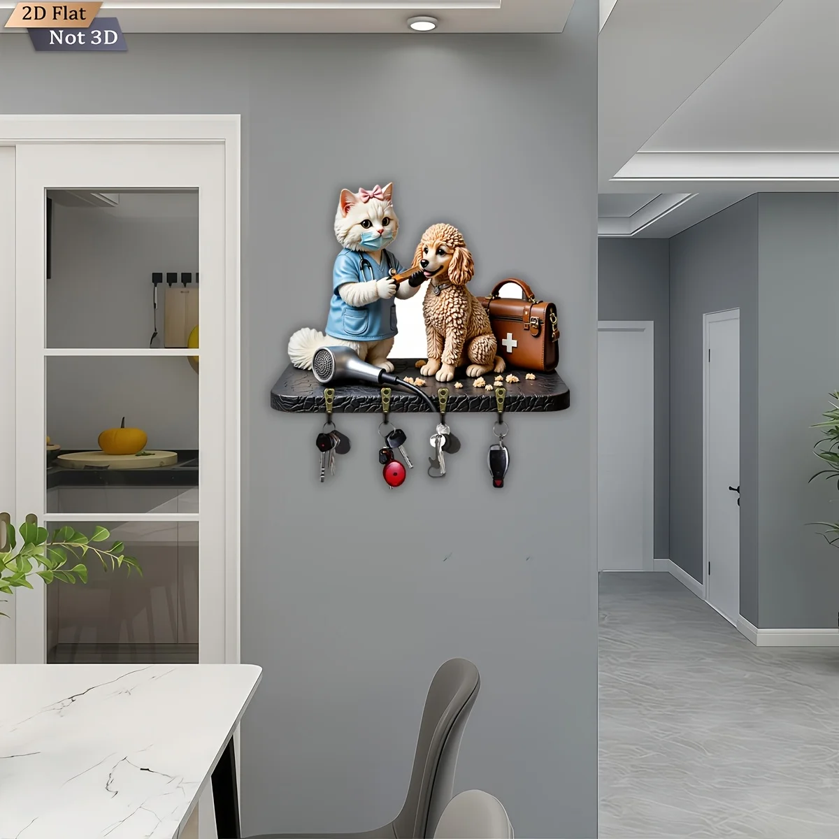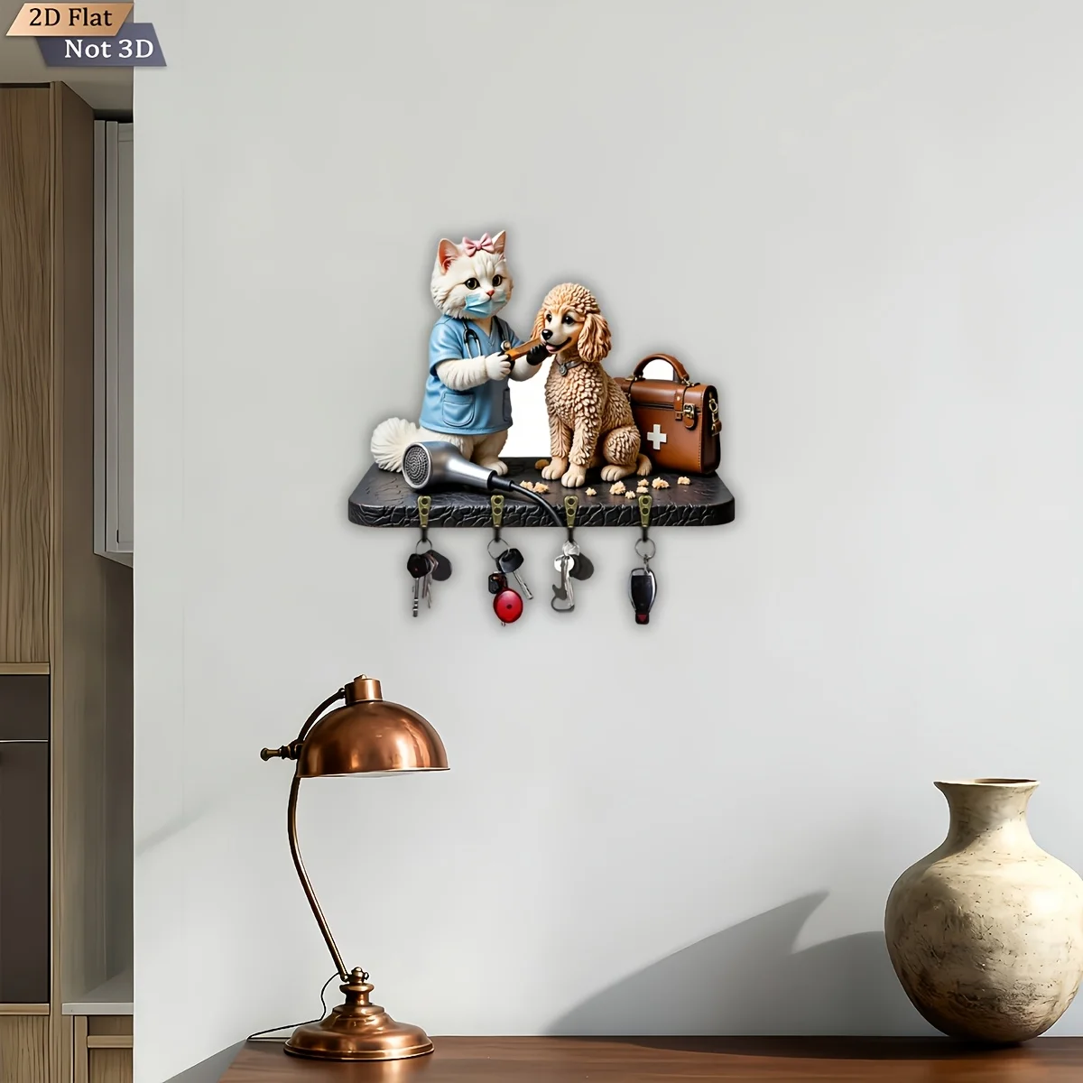 Cute Cat and Poodle Wooden Multi-functional Key Holder with Four Metal Hooks Is Suitable for Wall Decoration