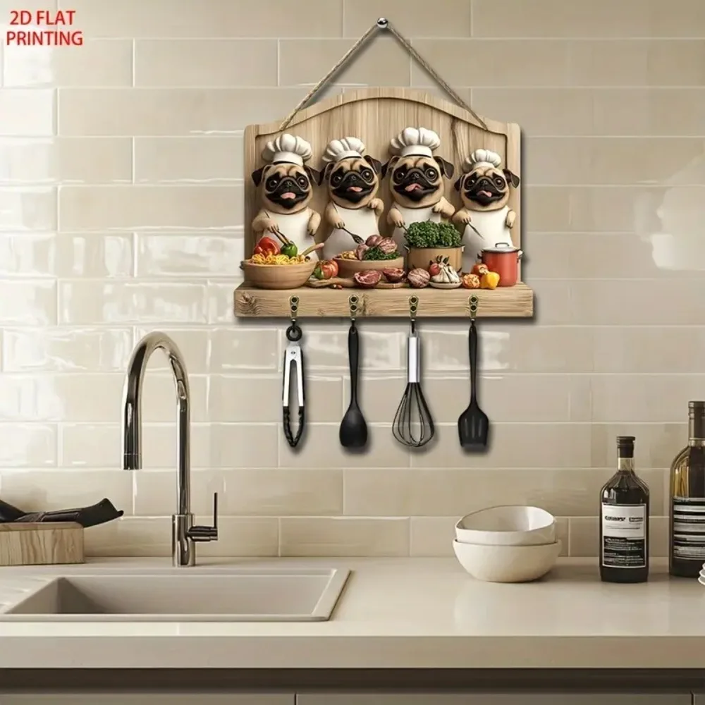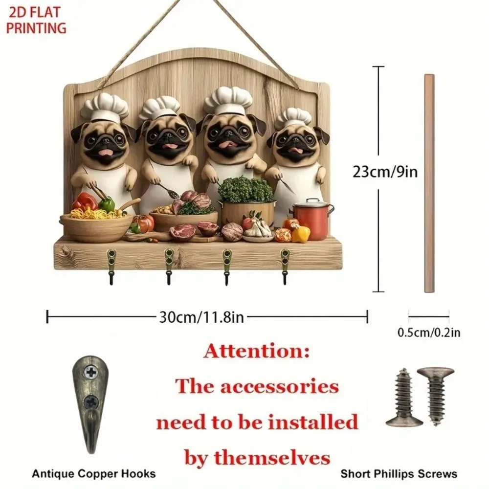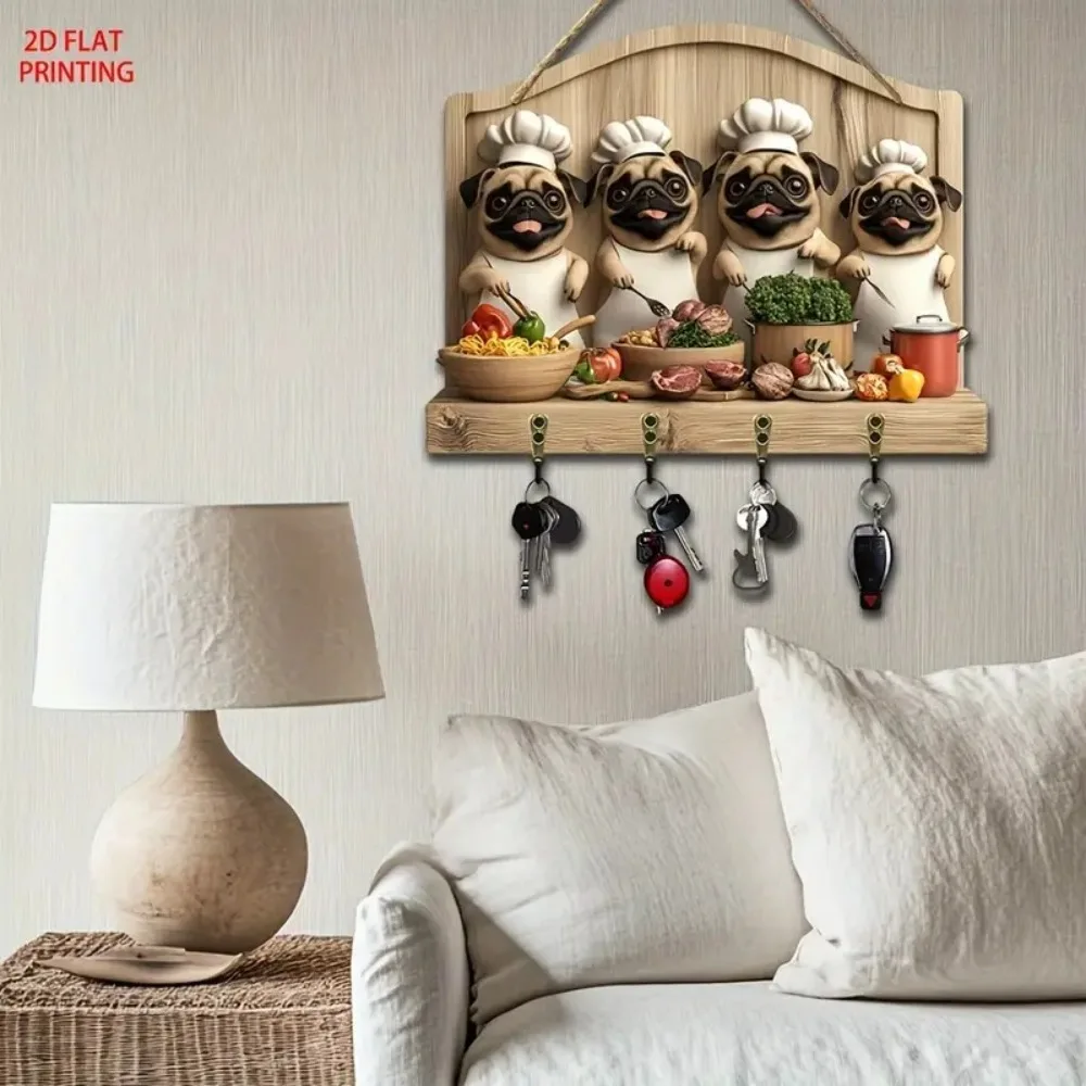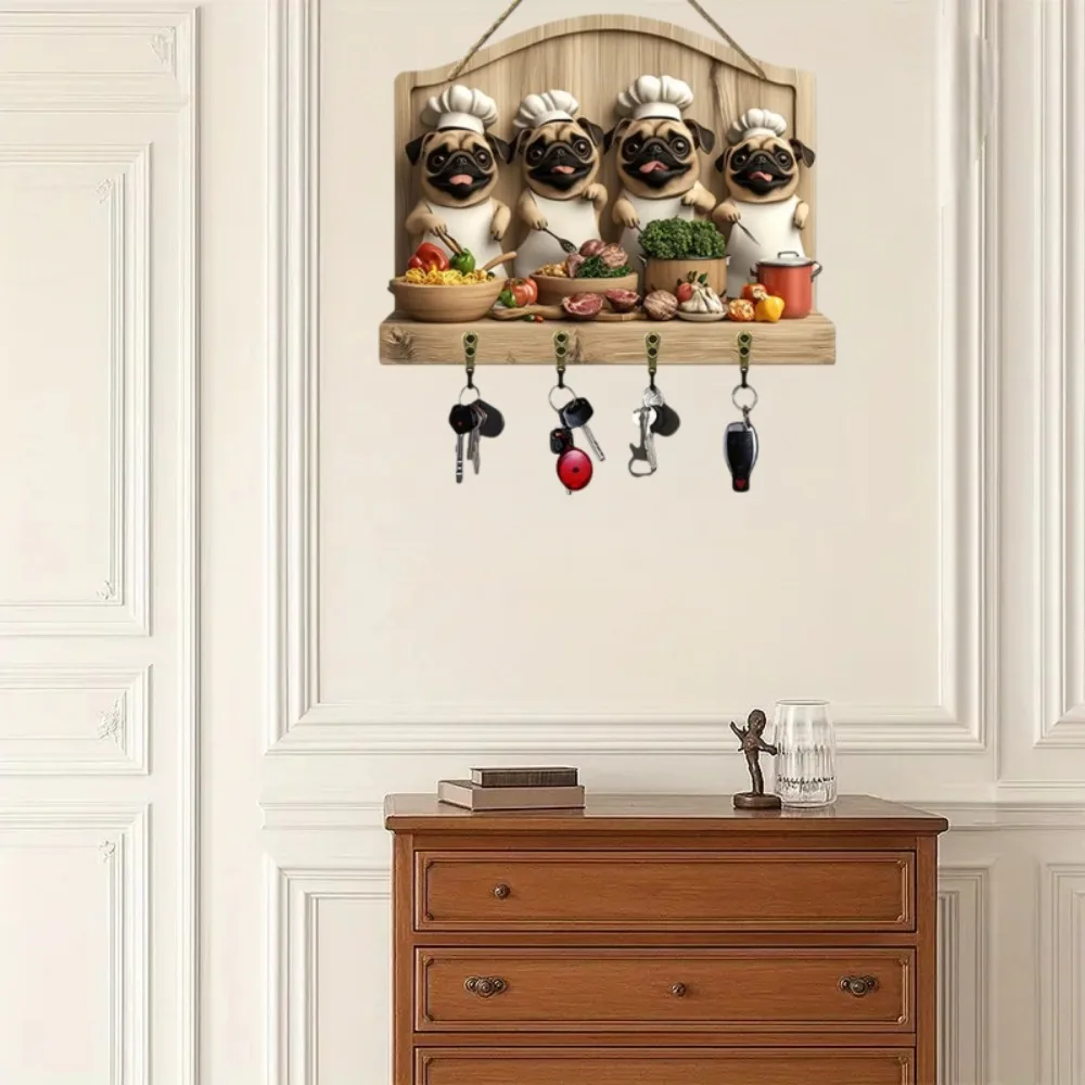 Cute Pug Chef Key Hanger with Four Metal Key Hooks Is Suitable for Home Decoration