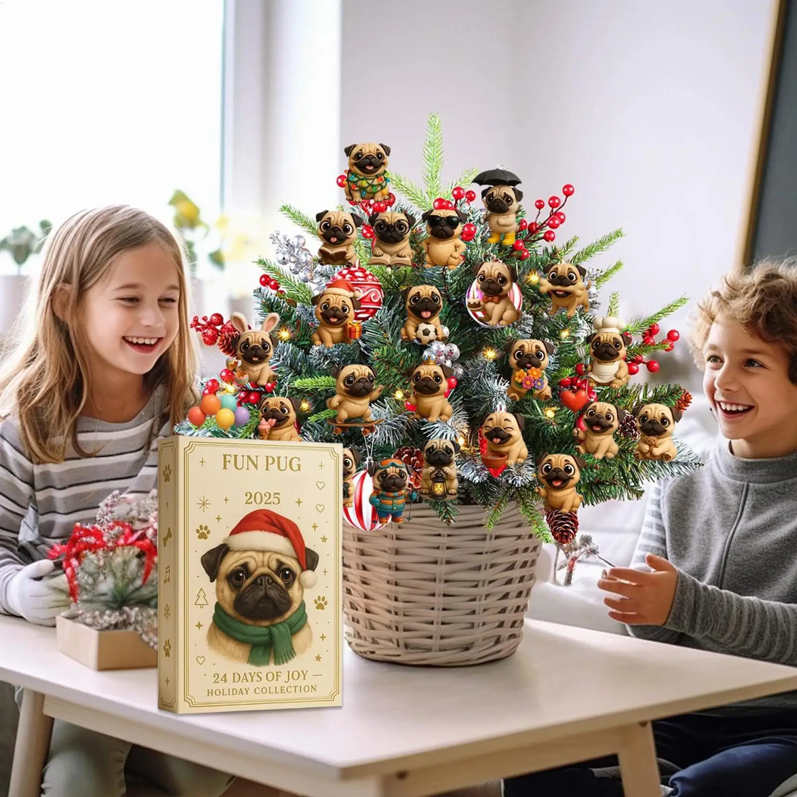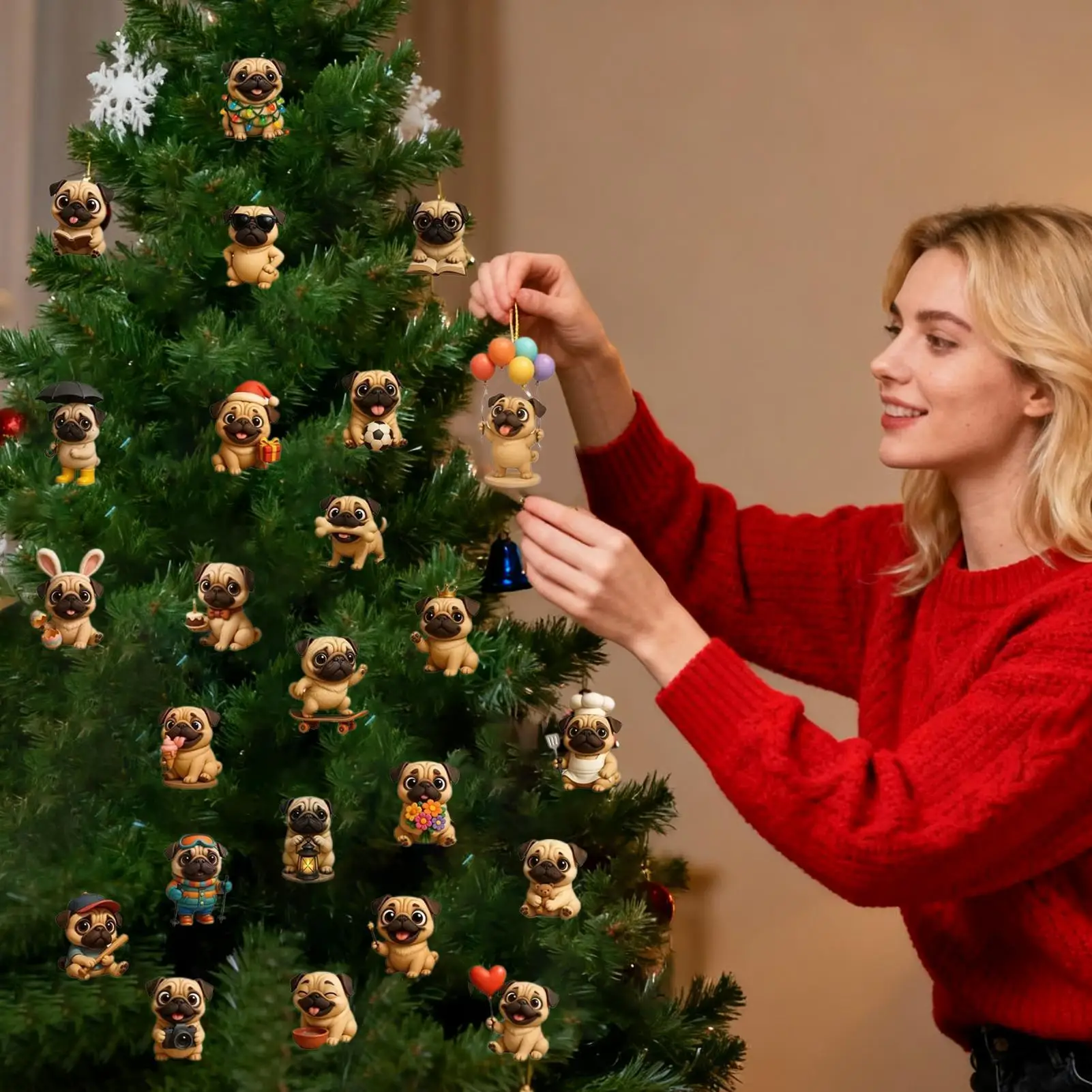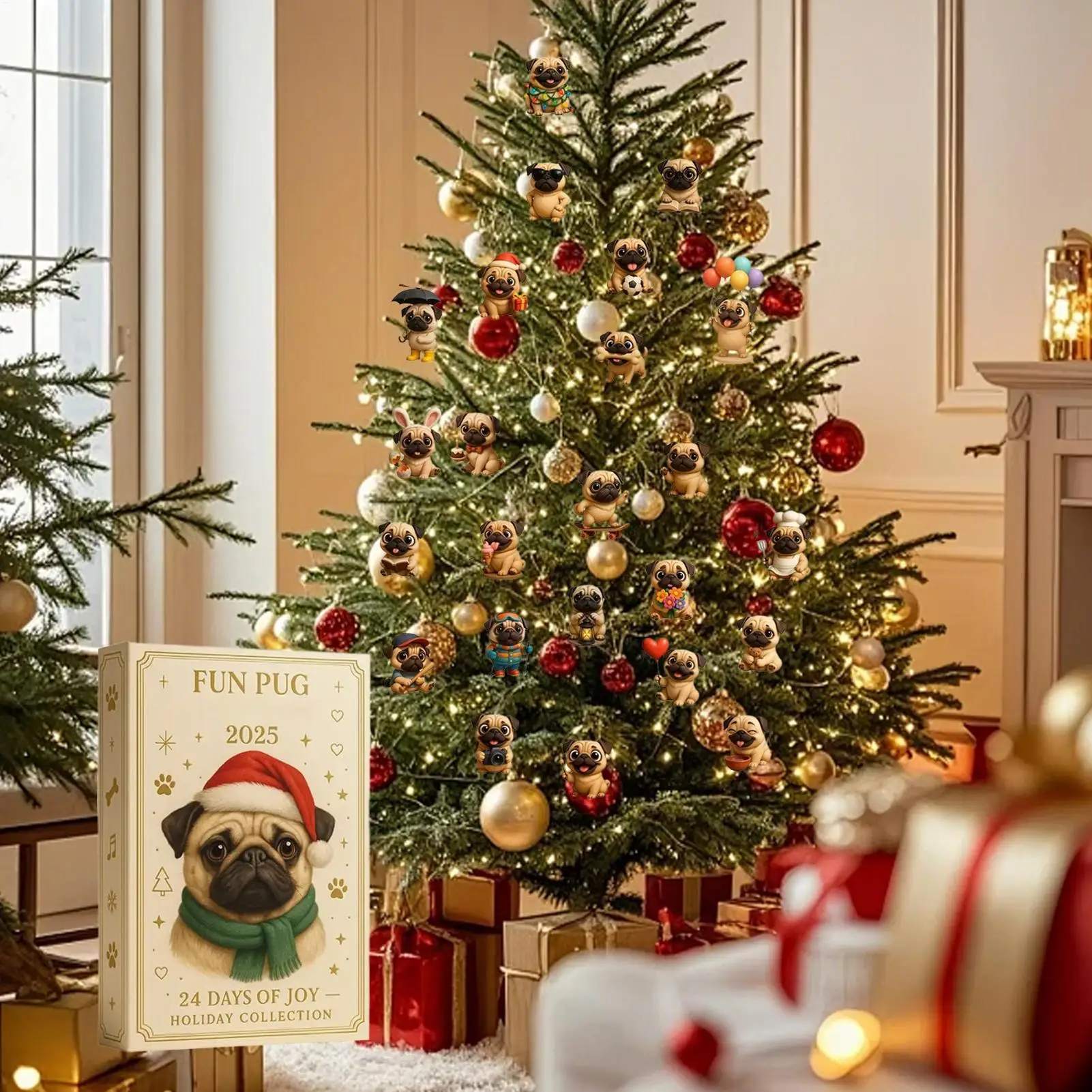 Pug Christmas Advent Calendar 2025, 24 Days Christmas Countdown Calendar Acrylic Cute Pug Ornaments For Tree Decor